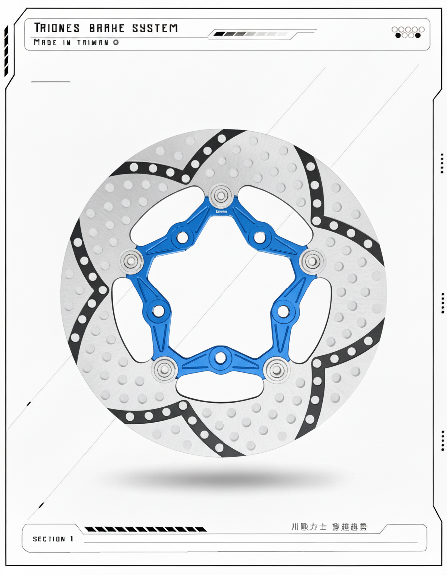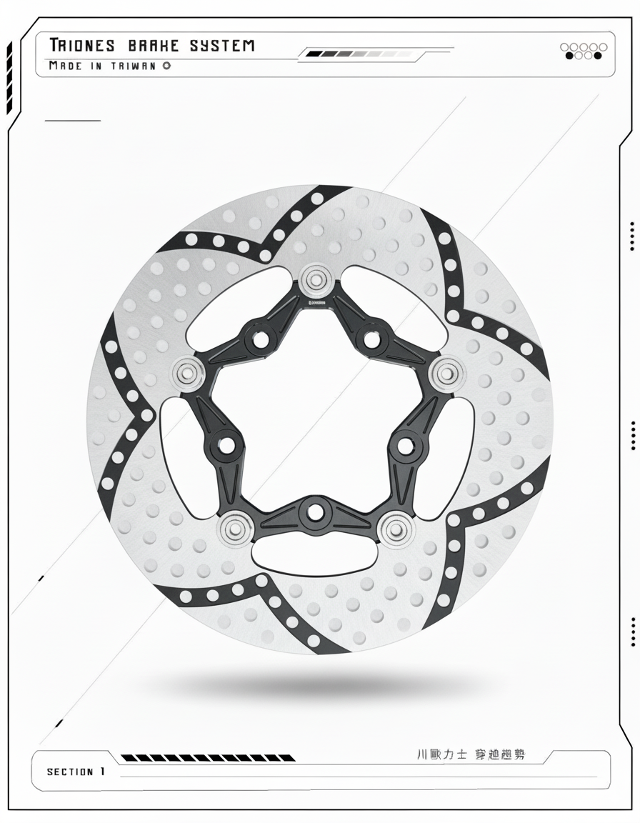 | 產品特色 | 1.內盤T6高強度鋁合金材質,陽極表面處理 2.外盤白鐵材質,採圓打孔設計,強化散熱與排粉塵效果 3.外盤厚度4mm,符合國際安全規範 4.外盤雙面精密平整研磨,磨合期短,提高煞車效能 5.浮動扣白鐵材質,以專用機台沖壓固定(非C型扣) 6.浮動扣為真浮動設計,有效分散對向卡鉗產生的煞車剪力與應力,達最佳煞車效果 |